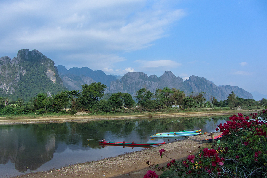In the afternoon, we start the trip back to Vang Vieng by kayak. The duration of the kayaking trip depends on the water level in the river. Enjoy paddling down the Nam Song river through idyllic scenes of rural life in the first plan and unique limestone mountain views in the second plan.